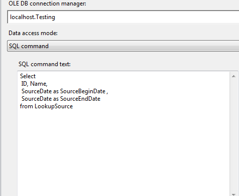 The source in the data flow is just a simple OLEDB source. I have duplicated the source date and gave both and alias. One called Source Begin Date and the other called Source End Date. This will give me the two dates I need in the lookup transform.