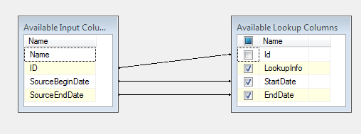 When setting up a lookup in SSIS it is usually just a basic comparison between two key fields like an ID field. What if you want to compare and id and also find the specific date range. Let’s say the id is in the lookup reference table multiple times and you need to find the one that is has the date that surrounds a source date.