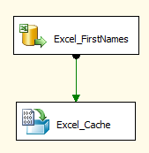The SSIS package will require two data flows. The first will load the excel file into cache. The second will have the table source and the lookup transform. Here is the Control Flow of the package.