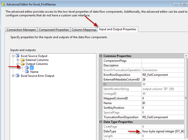 The Excel source is just a simple source with the ID column and the First Name Column. The only change you may have to make is to the data types in the excel source. I had to change the data type of the ID field to integer. That is because my table has an ID column with a data type of integer. To change the data type, right click on the excel source and select Advanced Editor. Click on the Input and Output Properties Tab, expand the output columns folder, select the ID column, and change the data type property as needed.