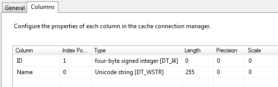 After you have the source ready, drag the green data flow line to the cache transform. Click the New button and give the cache connection manager a name. Then click on the columns tab and set the ID column’s index property to 1. You must have at least columns with an index property value greater than zero.