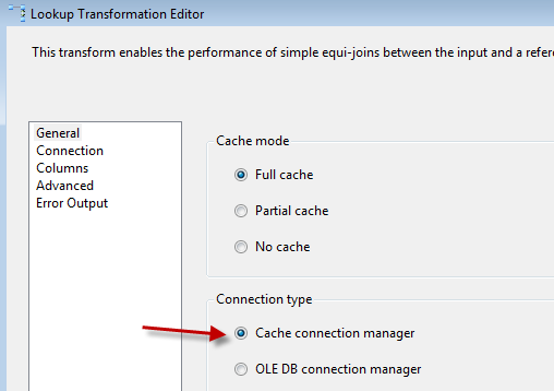 The OLEDB Source is just a select from a table pulling the ID and the Last Names. In the lookup transform, set the connection type to the cache connection manager.
