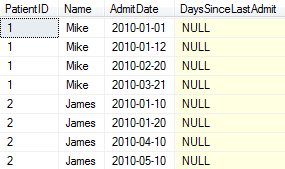 In this example have some data that shows the day a patient was admitted to the hospital and you want to figure how many days it has been since the person was in the hospital last. So you want to calculate the days since the last admit date. Here is the table.