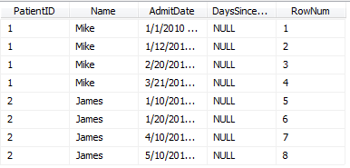 SELECT        PatientID, Name, AdmitDate, DaysSinceLastAdmit, ROW_NUMBER() Over(Order by PatientID, AdmitDate) as RowNum
