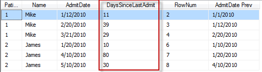 Now you have the admit date and the previous admit date on the same row. It is just a simple derived column using the DateDiff function to get the days since last visit. Here is the code for that.