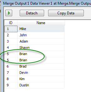 Execute the package and look at the data viewer. Notice the column with the ID of 5 is repeated. The Merge does not remove rows.