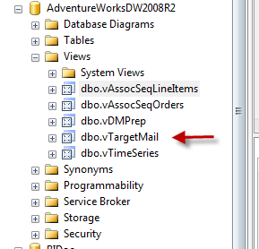 The design view shows you the query used to create the view. The dim Customer Table and another view are used to create the Target Mail view. From Dim Customer we get a lot of the customer information and the other view has the bike purchase information. This gives you a simple view of who has bought a bike and the attributes of those customers.