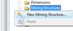 1. Right Click on the Mining Structures folder in the Solution Explorer and select New Mining Structure. Next->