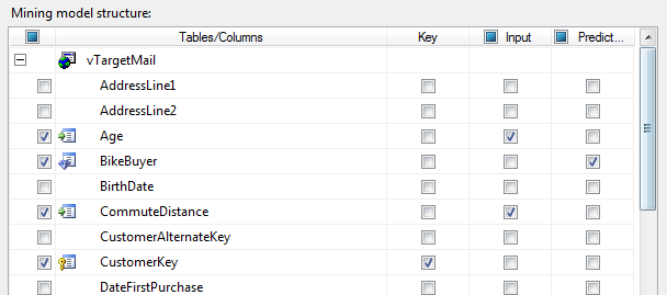 Now you are on the screen asking what data you want to use to train your mining model. Here you will place a check next to the columns you want to use in determining which members will most likely be bike buyers based on your existing customers. You also need to select a Key and a Predict column. The Key will be the Customer Key and should already be checked. The Predict columns will be the BikeBuyer because that is what we are trying to predict.