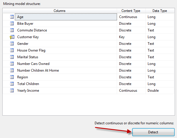 8. Click the detect button. This is setting the data types for the mining model. A description of each of these types can be found here. http://msdn.microsoft.com/en-us/library/ms174572.aspx