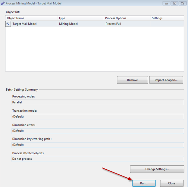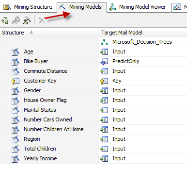 You have now created the Mining Structure and a Mining model using the Decision Tree Algorithm. Now it is time to process and deploy the model. Click on the Mining Models Tab and view the Model. Notice the Bike Buyer is set to Predict Only and the Customer Key is the Key. The rest of the columns are set to input.