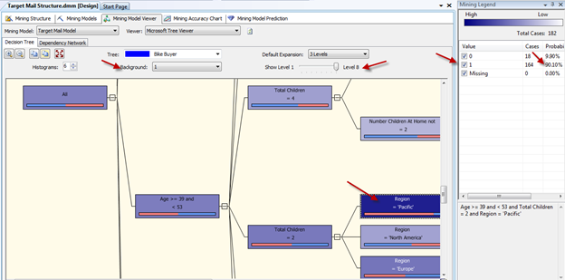 Now you will be in the Mining Model Viewer and be able to see the Decision Tree model Notice how age is in the first level of the tree. Now browse the model and you can see what traits of the customers are most likely to buy a bike. Change the background to 1 to see the most likely bike buyers. Slide the level over to the right to see all levels.