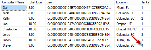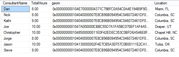 Here is a sample of my data. Here you can see I have four people in Columbia, SC. You will notice I also have the spatial data for the location of the city.