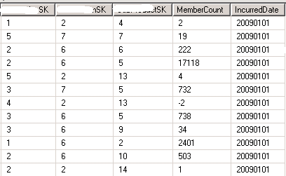 Here is an example of part of the membership fact table. Notice that the incurred date repeats. This is because it depends on which dimensions you slice on which member count you will get. This also needs to be summed up to the month level. After the month level it is no longer valid as a sum. This seems tricky but can be done with a calculation. The original member count measure is set to sum on the measure properties. This measure is set to hidden also because the sum is invalid over the month level.