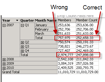In this calculation you can see the case statement is just dividing the member count by 12 at the year level and 3 at the quarter level. The member count is not valid below the month level so this takes care of all the possibilities. You will also notice that the calculation includes all three of the date hierarchies. This ensures the calculation works in all date dimensions. This can be shown on the reports and will show the correct member count for every level in all the date dimensions. The below image is of the member numbers with just the summation and the other after the above calculation. By dividing with the number of months we get the average instead of the sum at the quarter and year level, which is what we want.