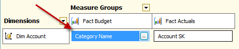 To set up this you will need to open the dimension usage tab in the cube editor. Click on the connection between dim account and fact budget and set up the category code as the key between the tables. The category code will be the relationship between the dimension and the fact table. A foreign key between the tables does not need to exist.