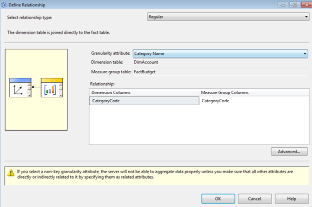 when i am trying to set granularity attribute as Category Name then automatically relation attribute is changed from category code to Category Name but as per ur demo its showing as Category Name as granularity attribute and made relation between fact budget and dimaccount with category code can you please explain how to set