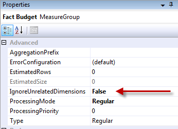 One other change is to set the budget measure group to ignore unrelated dimensions. This is in the Cube Structure tab, click on the budget measure group and change this property. It will need to be false, I know this seems backwards.