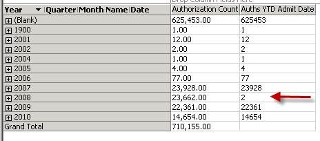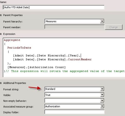 My first thought was data issue. After querying the table and finding no issues I returned to the MDX calculations in the cube and started trouble shooting. Here is what I found. The format string is set to standard when you drag over the Period to Date template.