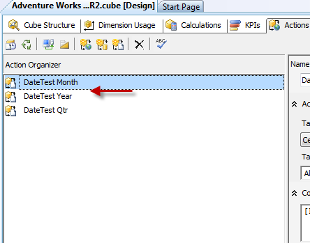 Here you can see three reporting actions in a cube in SSAS. Each one handles a different date level. The user will see only one action when clicking in excel.