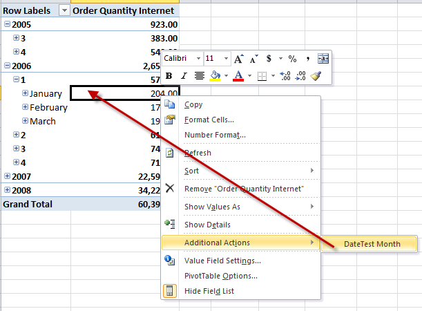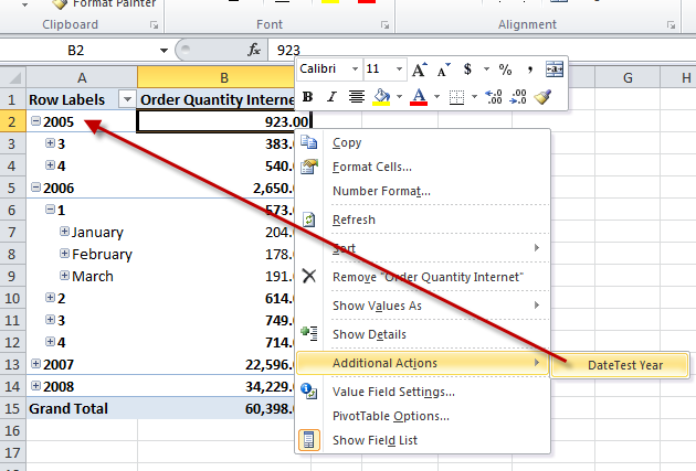 Now in excel, when the users right click on a field, they will see the report action for the clicked level. Here are some images of this in action.