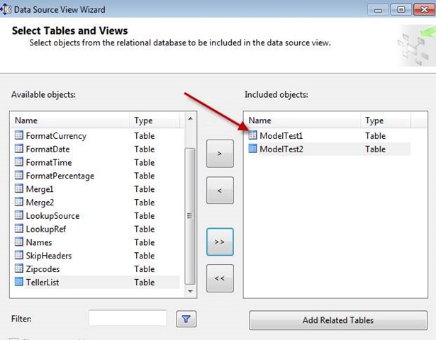 After you create the DSV (Data Source View), right click on the DSV and select open.You will see the two tables in the DSV view.